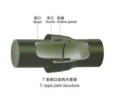 T型接口的結(jié)構(gòu)如圖所示。接口安裝時,管子的插口外壁擠壓安放在承口內(nèi)的橡膠圈,使其壓縮變形而產(chǎn)生一定的接觸壓力, 利用橡膠圈的自密封作用來保持接口的密封性。