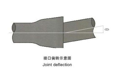 該接口具有結(jié)構(gòu)簡單,安裝方便,密封性能好等特點。在承口結(jié)構(gòu)上考慮了密封圈的定位和接口的偏轉(zhuǎn),通過控制插口的安裝深度,使得接頭具有一定的軸向伸縮量,因此,這種接口能適應一定的基礎(chǔ)沉降,同時可利用其偏轉(zhuǎn)角θ實現(xiàn)管線長距離的轉(zhuǎn)向安裝,接口偏轉(zhuǎn)安裝如圖所示。膠圈由硬膠和軟膠兩部分組成,硬膠對管道接口有一定支撐和對心作用,同時安裝時也需要更大的推力。